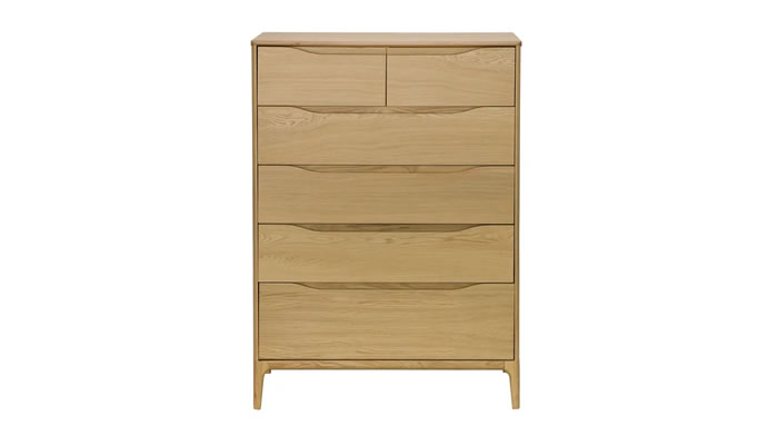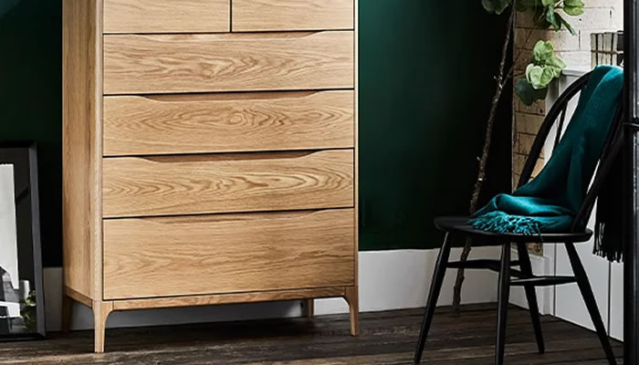 The ercol Rimini 6 drawer tall wide chest in light oak is well proportioned for the compact bedroom and offers plentiful and versatile storage.