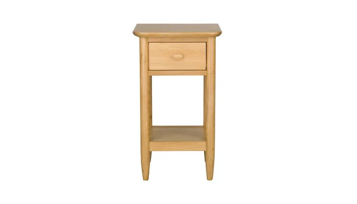 Ercol Teramo Compact Side Table The ercol Teramo compact side table finished in clear matt oak features a single drawer for storage, tapered turned legs and curved overhanging surfaces.