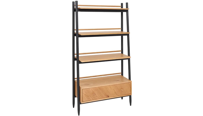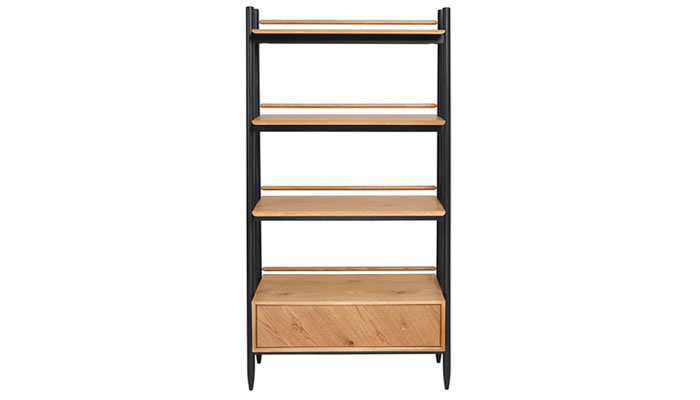 Ercol Monza Shelving Unit The ercol Monza Shelving Unit is ideal for organising and staging books, photos and other precious mementos on. Three shelves and a deep drawer in brushed oak framed by the black legs.