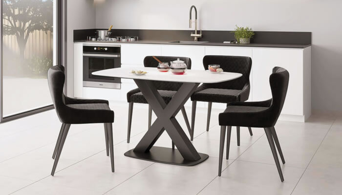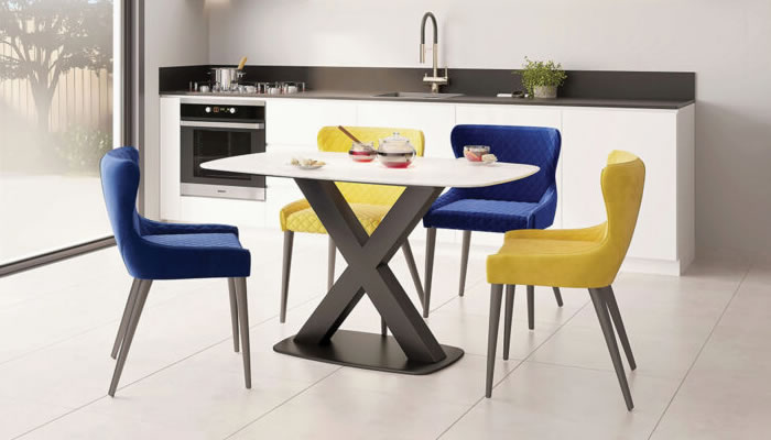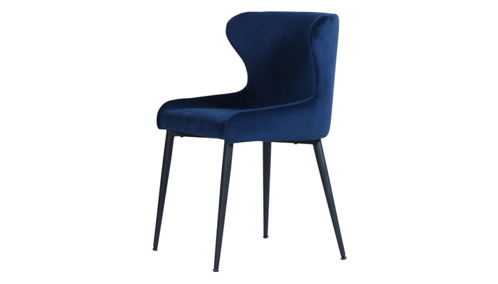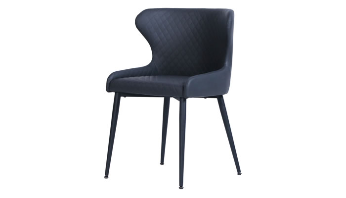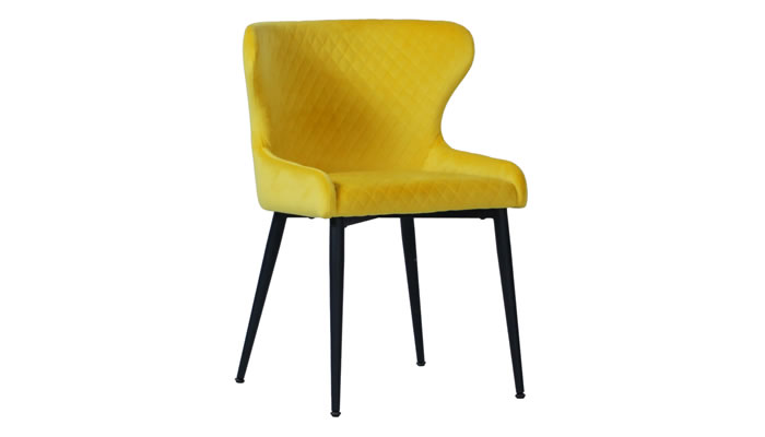 Orion Chairs Dining Chair This Orion dining chair has a wrap around semi circle design and subtle diamond stitching. Available in navy or yellow velvet and grey or brown PU with black powder coated legs.