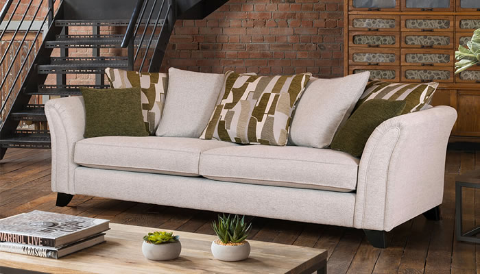 Alstons Emelia Grand Sofa Pillow Back The Alstons Emelia pillow back grand sofa is a simple uncomplicated design without compromise on style or quality for price. Available in a selection of fantastic fabrics that include the latest colour trends and a choice of two leg finishes to match your personal decor.